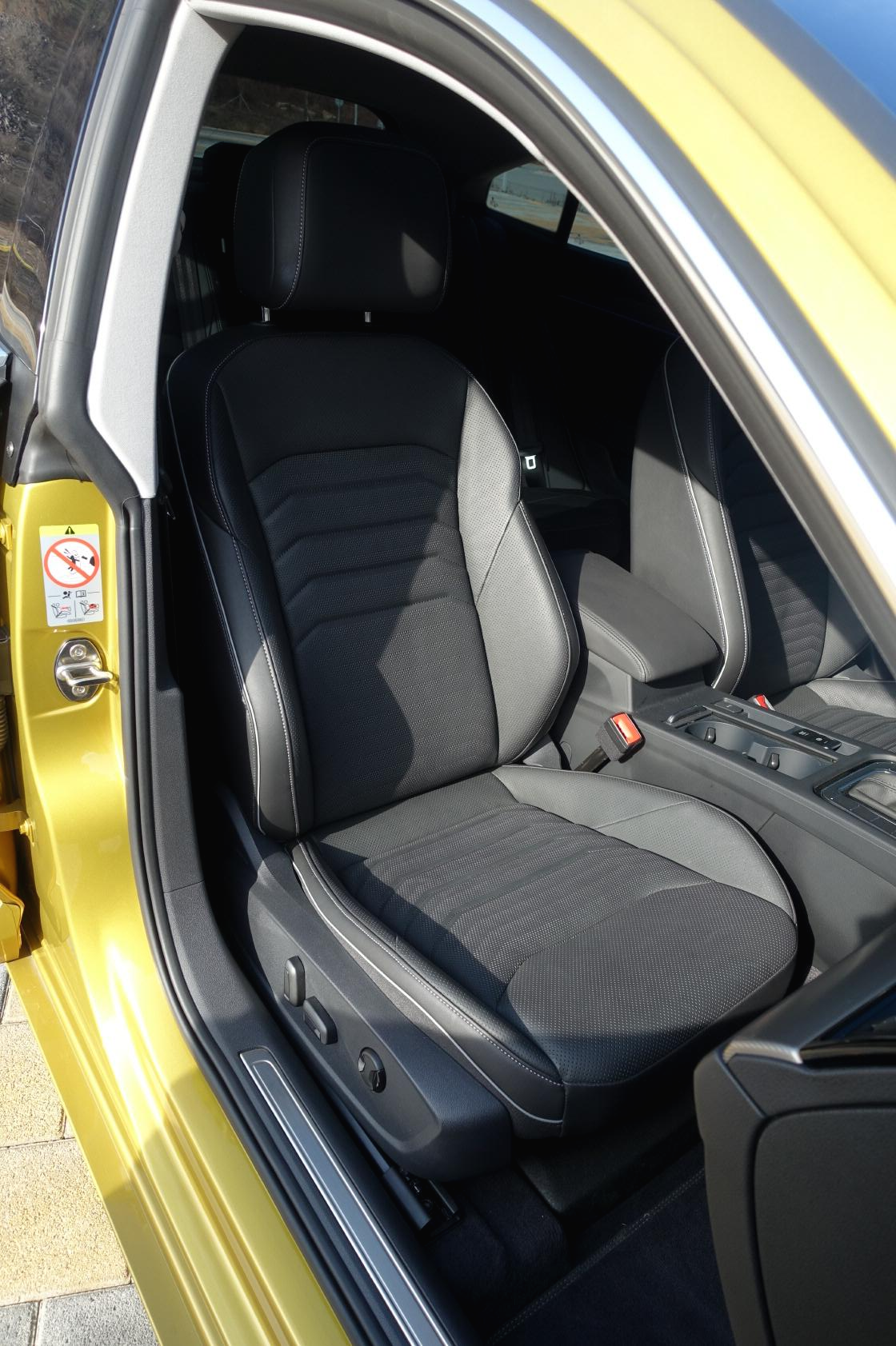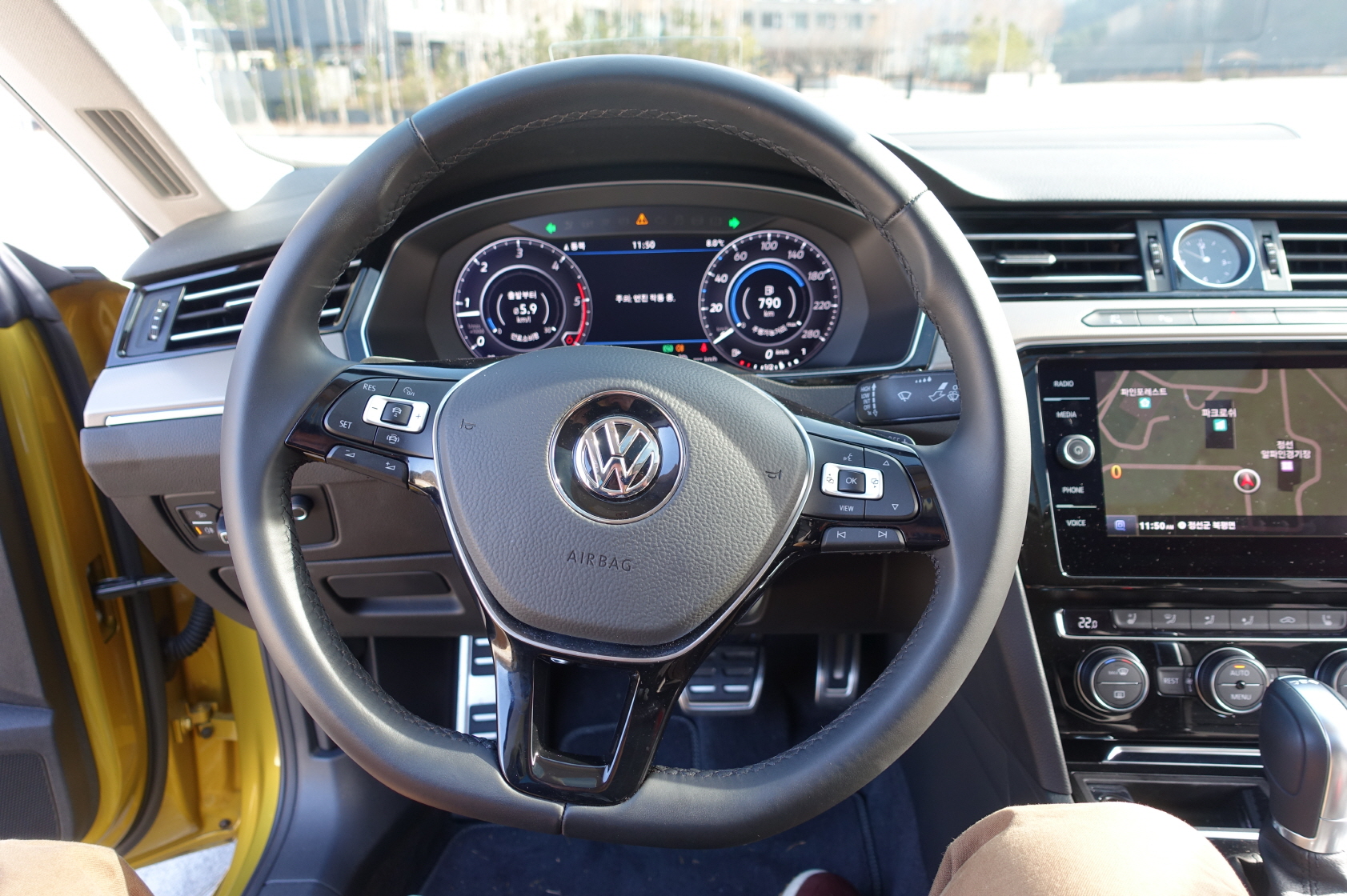 운전대를 중심으로 내부는 전형적인 폭스바겐의 느낌이에요. 군더더기 없이 깔끔한, 기능별로 잘 묶어놨습니다. D컷 스티어링휠도 갖췄는데 파지하기가 참 좋습니다. 아주 다이내믹하게 달릴 것 같은 운전대를 갖고 있고 시트도 훌륭합니다. 몸통을 되게 잘 잡아줘요. 시프트 패들도 갖췄죠.